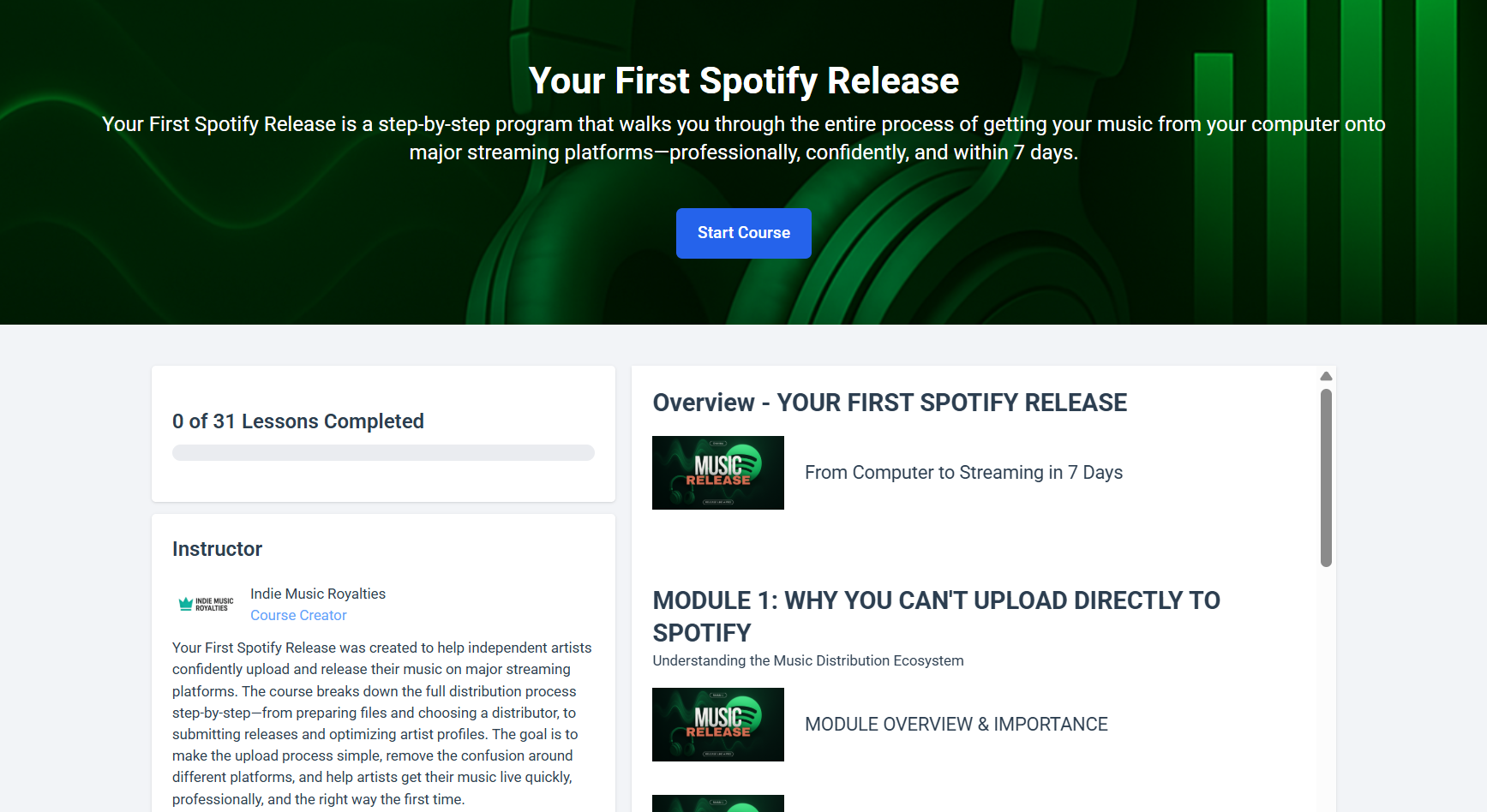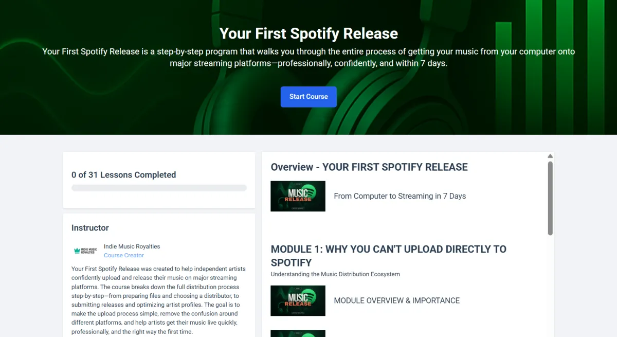 A: Your First Spotify Release is perfect for independent artists who have finished music but don’t know how to release it properly—and want a simple, step-by-step process to get their first song on streaming platforms confidently.